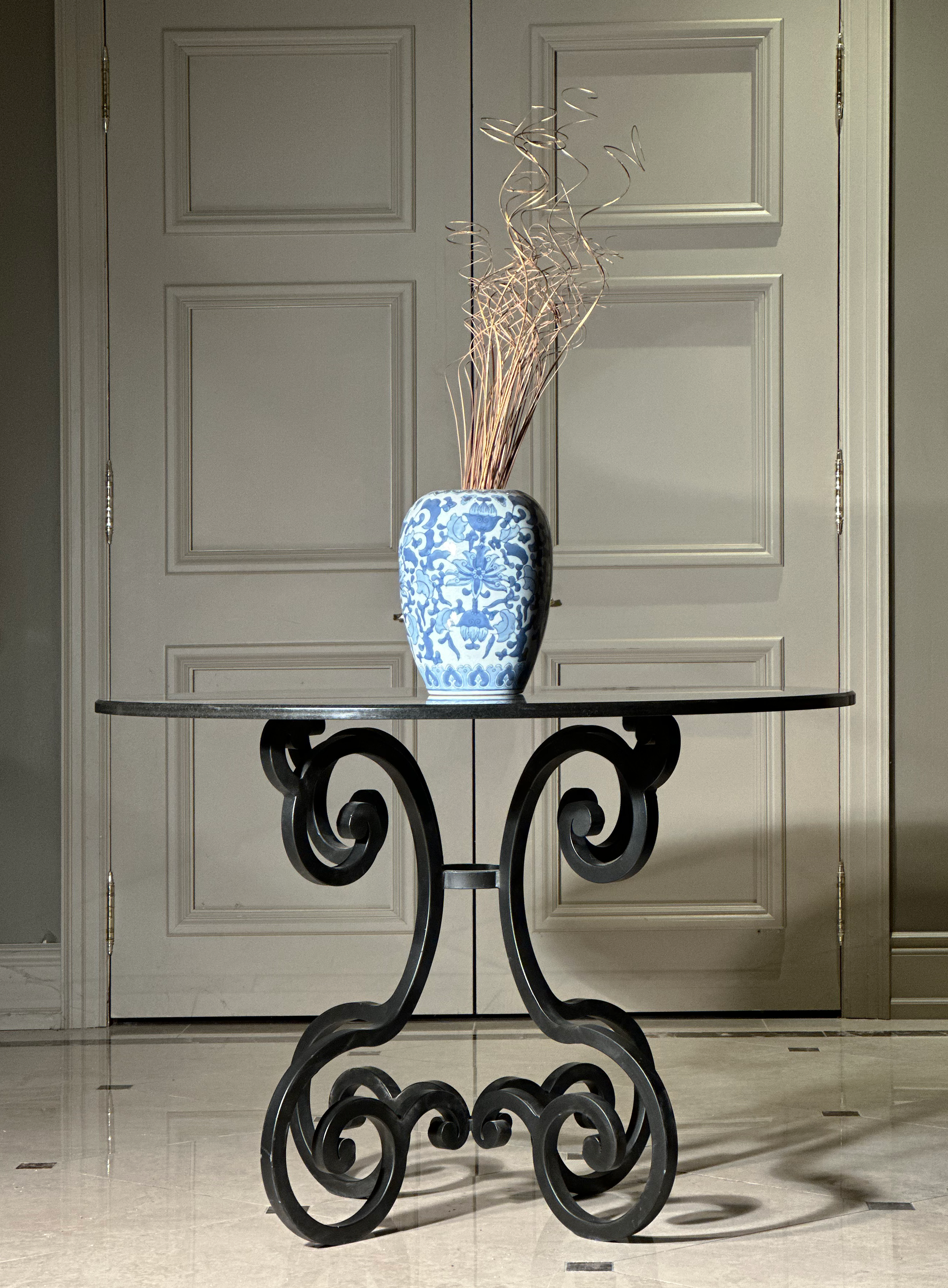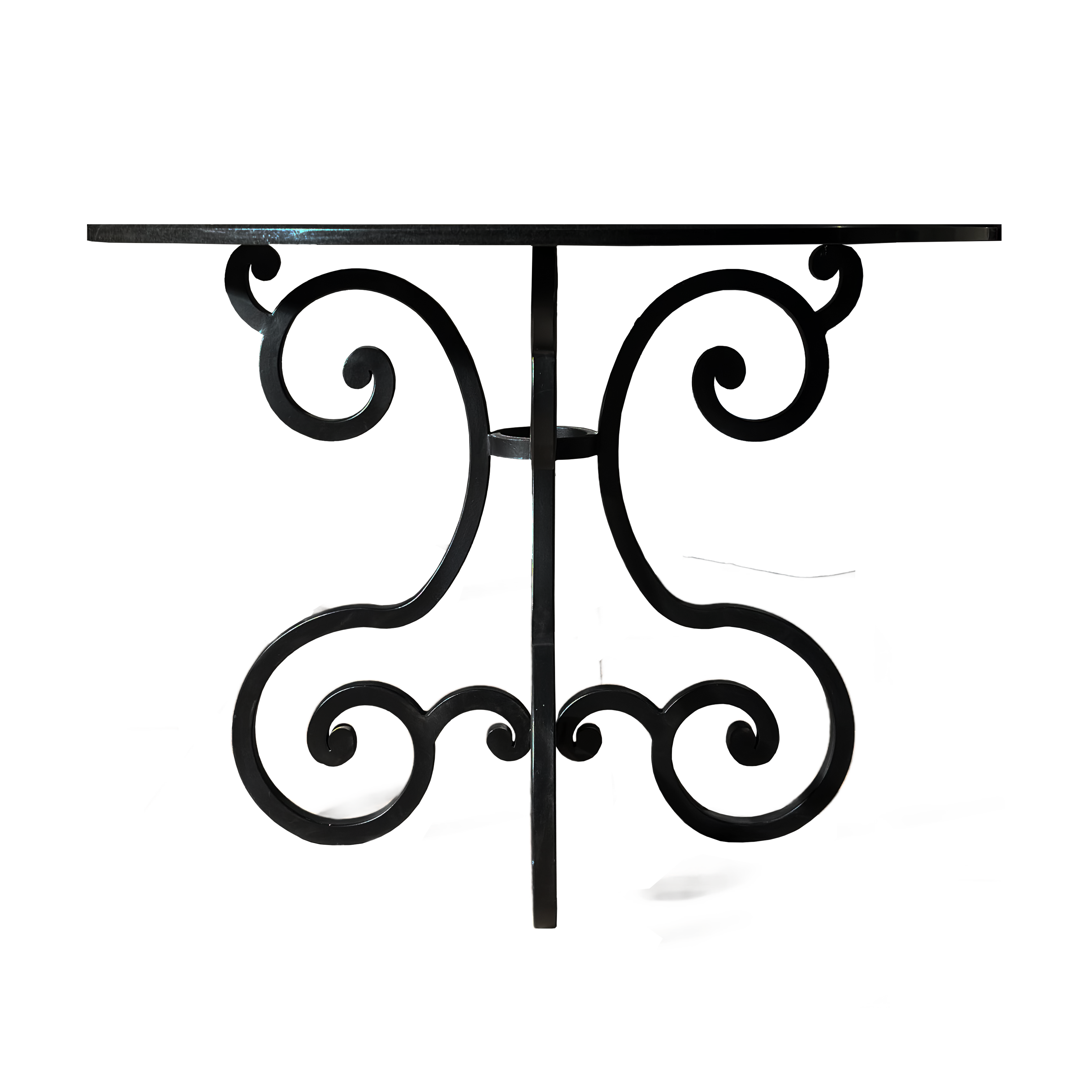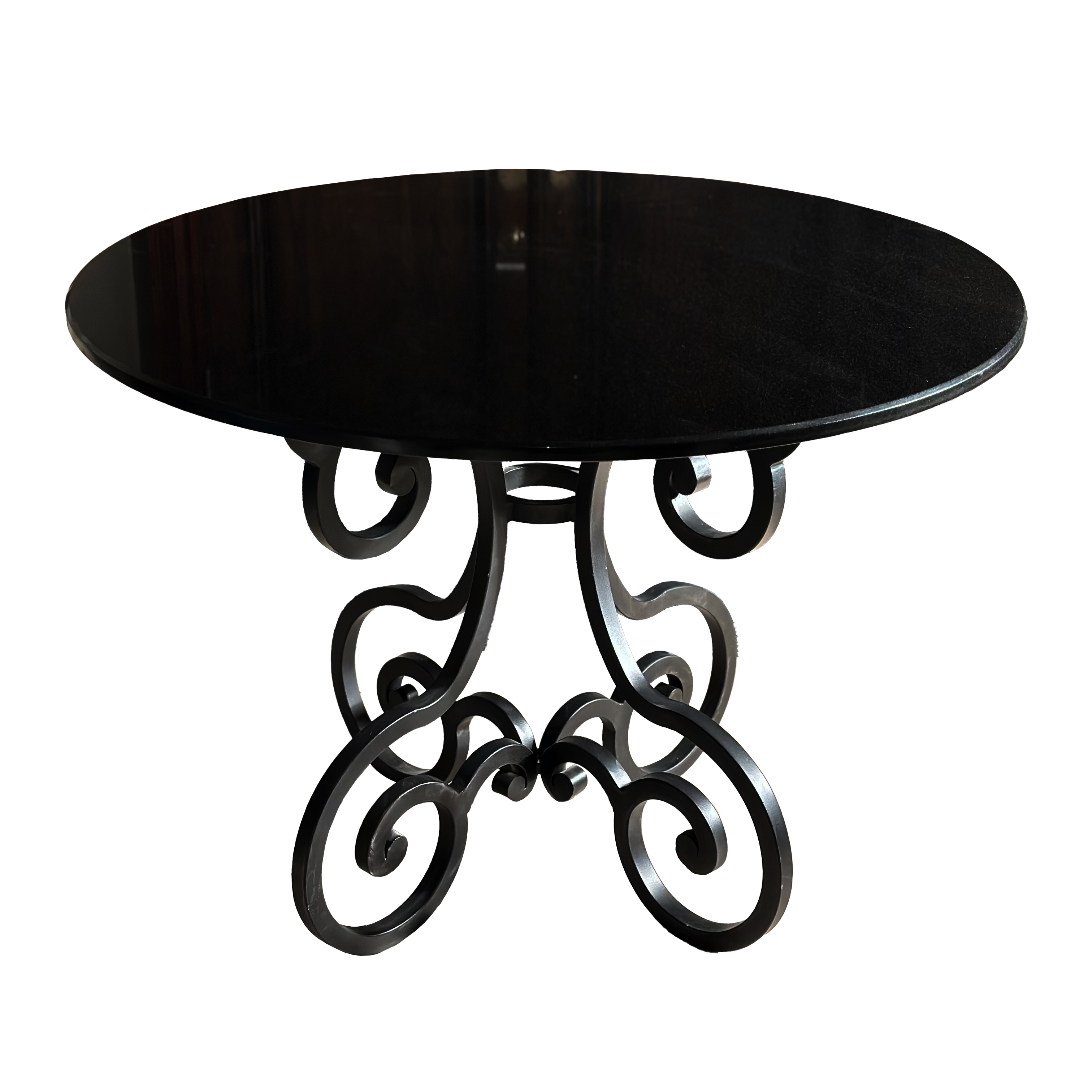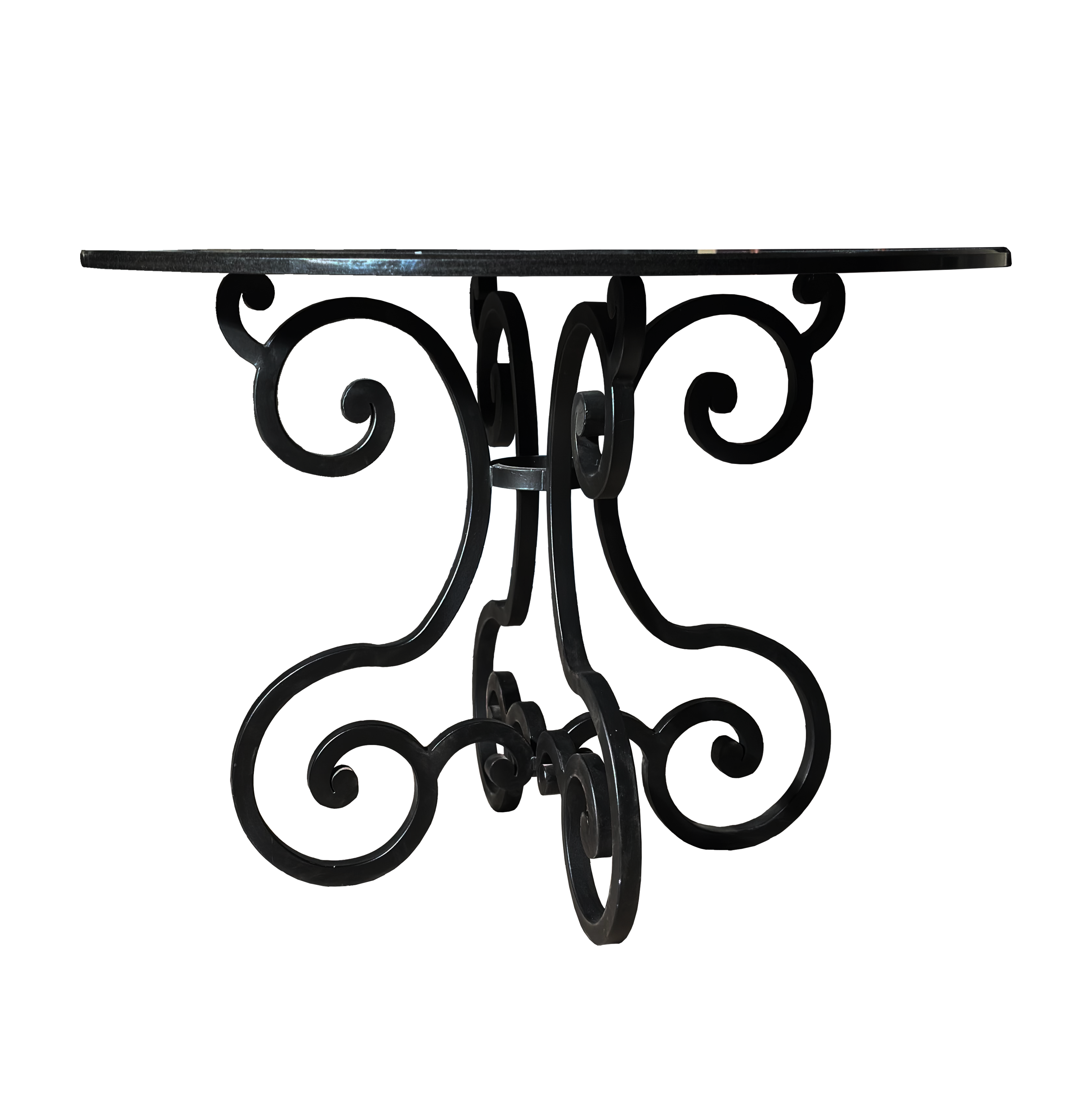 Crafted with meticulous attention to detail, this stunning table effortlessly blends classic elegance with modern sophistication. The wrought iron stand boasts intricate craftsmanship, providing both durability and a touch of artistic flair. Topping off the piece is a lustrous black marble surface, exuding timeless luxury and refinement. With its harmonious blend of textures and tones, this table serves as a captivating centerpiece in any setting, offering both style and functionality in abundance.